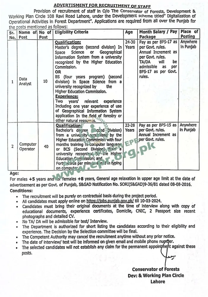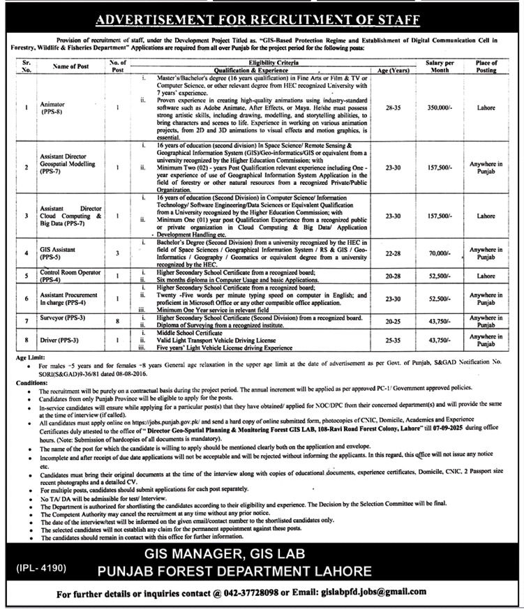 Gazetted Jobs under Project titled GIS-Based Protection Regime and Establishment of Digital Communication Cell in Forestry, Wildlife & Fisheries Department.